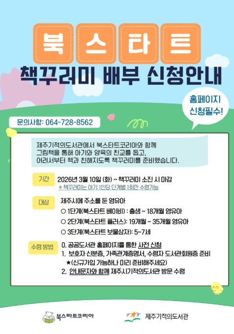 [뉴스앤톡] 제주기적의도서관은 영유아의 평생 독서 습관 형성을 위해 북스타트 사업 ‘내 생애 첫 선물, 책꾸러미’ 배부 대상을 확대한다.