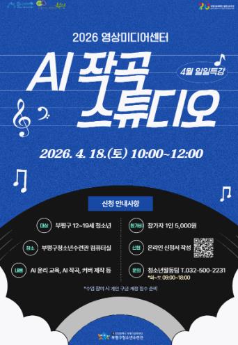 [뉴스앤톡] 부평구청소년수련관은 오는 18일 오전 10시 수련관에서 인공지능(AI)을 활용해 자신만의 디지털 앨범을 만들어보는 ‘AI 작곡 스튜디오’를 운영한다.
