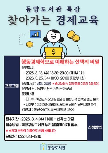[뉴스앤톡] (재)인천광역시계양구인재양성장학교육재단 동양도서관은 성인을 대상으로 ‘찾아가는 경제교육 특강’을 운영한다고 밝혔다.
