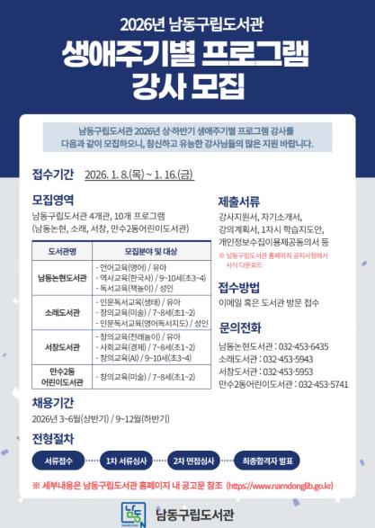 [뉴스앤톡] 인천시 남동구 구립도서관은 3~12월까지 운영하는 ‘2026년 상·하반기 생애주기별 프로그램’에 함께 할 프로그램 강사를 공개 모집한다고 12일 밝혔다.