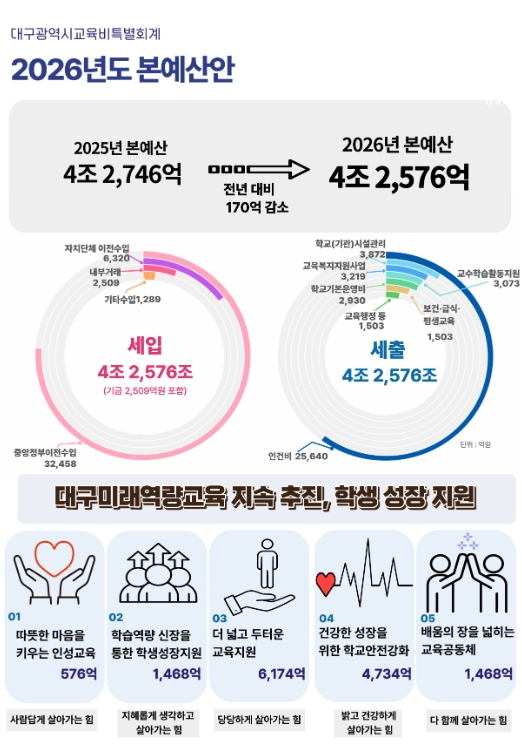 [뉴스앤톡] 대구시교육청은 2026년도 대구광역시교육비특별회계 예산안을 올해 예산보다 170억 원 감액된 4조 2,576억 원으로 편성해 10월 27일 대구시의회에 제출했다고 밝혔다.