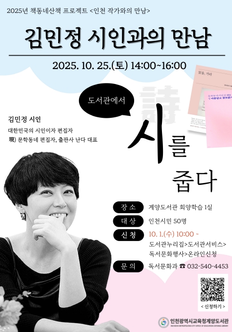 [뉴스앤톡] 인천광역시교육청계양도서관은 10월 25일 오후 2시 ‘책동네산책 프로젝트’의 일환으로 ‘김민정 시인과의 만남’을 개최한다.