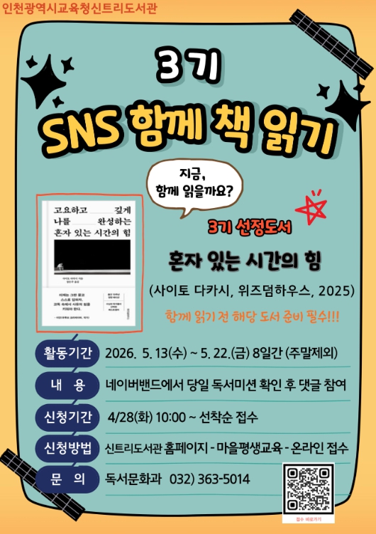 [뉴스앤톡] 인천광역시교육청신트리도서관은 시민의 일상 속 독서 참여를 확대하고 온라인 기반 독서 문화를 활성화하기 위해, 4월 28일부터 ‘SNS 함께 책 읽기’ 3기 참여자를 모집한다.