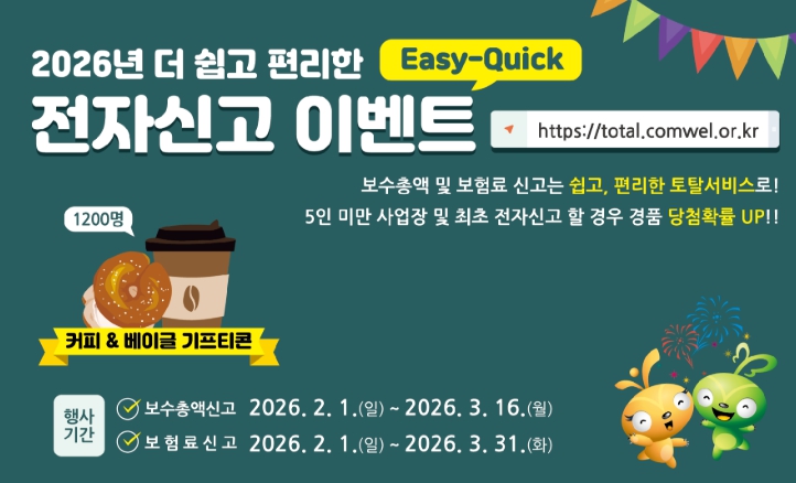법정 신고기한(3월 16일) 내에 전자신고를 완료하면 고용·산재보험료 최대 1만원 경감 혜택과 함께 추첨을 통해 기프티콘(커피 & 베이글) 당첨의 행운도 누릴 수 있다.