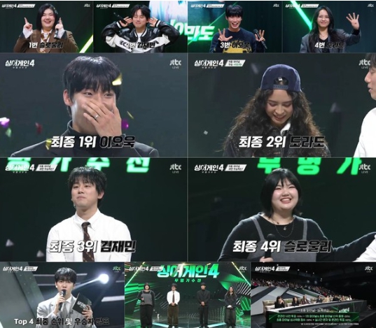 지난(6일) 방송된 JTBC ‘싱어게인-무명가수전 시즌4’(기획 윤현준, 연출 위재혁/이하 ‘싱어게인4’) 최종회에서는 TOP 4 슬로울리, 김재민, 도라도, 이오욱이 최종 우승을 향한 마지막 경연을 펼쳤다.