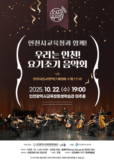 [뉴스앤톡] 인천광역시교육청평생학습관은 10월 22일 오후 7시 평생학습관 미추홀에서 인천시립교향악단의 ‘인천시교육청과 함께! 우리는 인천! 요기조기 음악회’를 개최한다고 밝혔다.