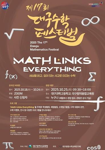 [뉴스앤톡] 대구시교육청이 주최하고 대구중등수학교육연구회가 운영하는 ‘제17회 대구수학페스티벌’이 10월 25일 9시 30분부터 대구과학고 및 대구창의융합교육원에서 'Math Links Everything(수학은 모든 것을 연결한다)'이라는 주제로 개최된다.