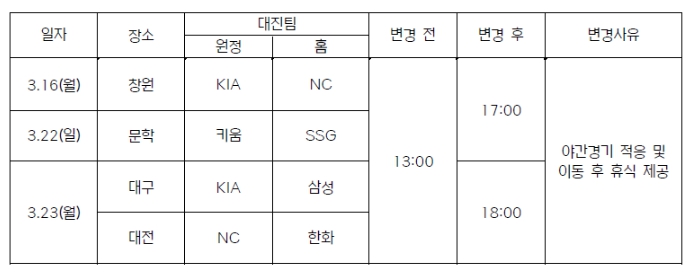 [뉴스앤톡] 2026 KBO 시범경기 중 일부 경기의 개시 시간이 야간경기 적응 및 이동 후 휴식 제공을 위해 변경됐다.
