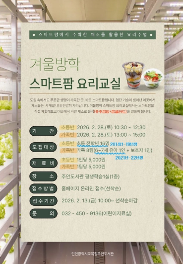 [뉴스앤톡] 인천광역시교육청주안도서관은 오는 28일 ‘겨울방학 스마트팜 요리교실’을 운영한다.
