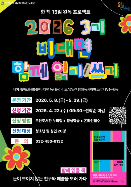 [뉴스앤톡] 인천광역시교육청주안도서관은 청소년 및 성인 대상 비대면 독서동아리 ‘비대면 함께 읽기·쓰기, 한 책 15일 완독 프로젝트’의 3기 참여자를 모집한다.