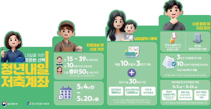'청년내일저축계좌'가입 대상은 신청 당시 근로중인 만 15세 이상 ~ 만 39세이하 청년 중 근로·사업소득이 월 10만원 이상이고, 청년이 속한 가구의 소득인정액이 기준 중위소득 50% 이하여야 한다.