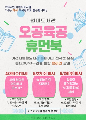 [뉴스앤톡] 이천시 청미도서관은 이천시 도서관의'나는 다시 도서관으로 출근합니다'와 연계한 '오공육공 휴먼북'을 운영한다. 이번 행사는 은퇴 세대의 풍부한 사회 경험과 전문 지식을 지역사회의 교육 자원으로 활용하고 청소년과 청년과의 소통을 통해 지역 멘토로서의 역할을 확대하고자 기획됐다.