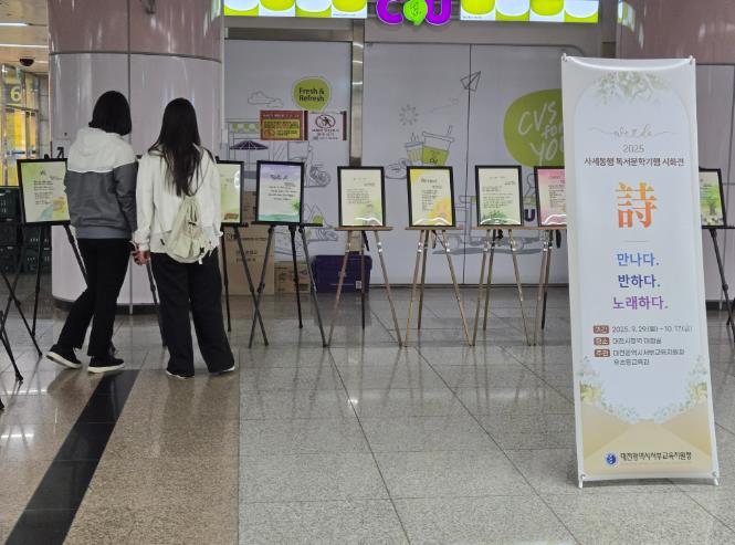 [뉴스앤톡] 대전서부교육지원청은 9월 29일부터 10월 17일까지 대전시청역 대합실(대전 서구 둔산중로 55)에서 2025학년도 사제동행 독서문학기행 참가자 28명의 시화 작품 전시회 '詩-만나다. 반하다. 노래하다.'