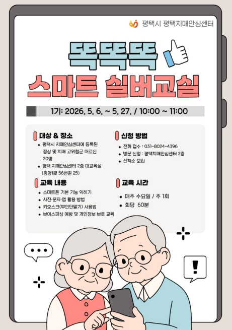 평택보건소 관계자는 “이번 프로그램은 치매 예방과 인지 기능 강화를 위해 어르신들의 디지털 활용 능력 향상을 목적으로 마련됐다”라며 “앞으로도 어르신들이 안전하고 능동적으로 디지털 환경에 적응할 수 있도록 지속적으로 지원할 계획”이라고 밝혔다.