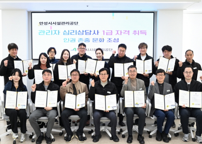 [뉴스앤톡] 안성시시설관리공단은 조직 내 인권존중 문화 정착과 관리자 상담 역량 강화를 위해 관리자 대상 심리상담사 자격 취득 교육을 실시하고 전원이 자격을 취득했다고 밝혔다.
