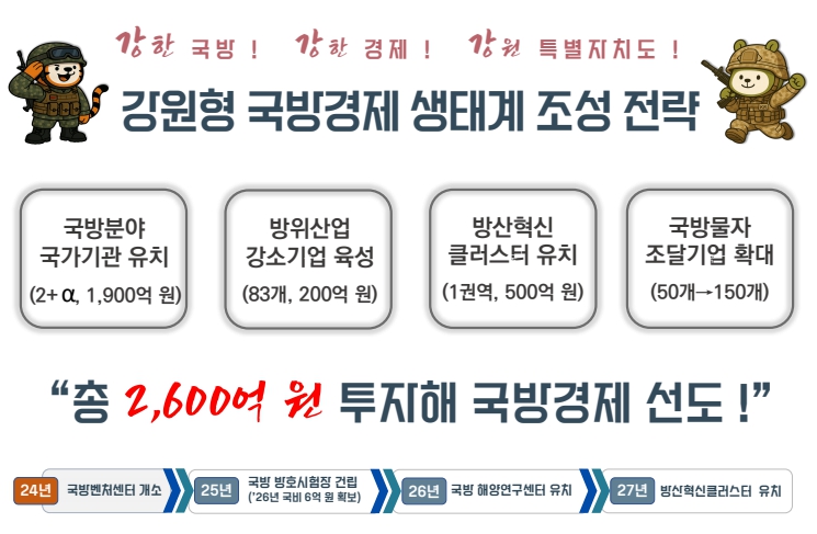 또한, 도는 방산혁신클러스터 유치에 도전한다. 500억 규모의 투자가 이루어지는 방산혁신클러스터는 방산특화기업, 군, 국방연구기관이 집적된 클러스터로 현재 전국에 3개 지역이 선정되어 있으며, 강원도는 주력 산업과 연계한 특화 분야 발굴을 통해 유치를 추진할 예정이다.