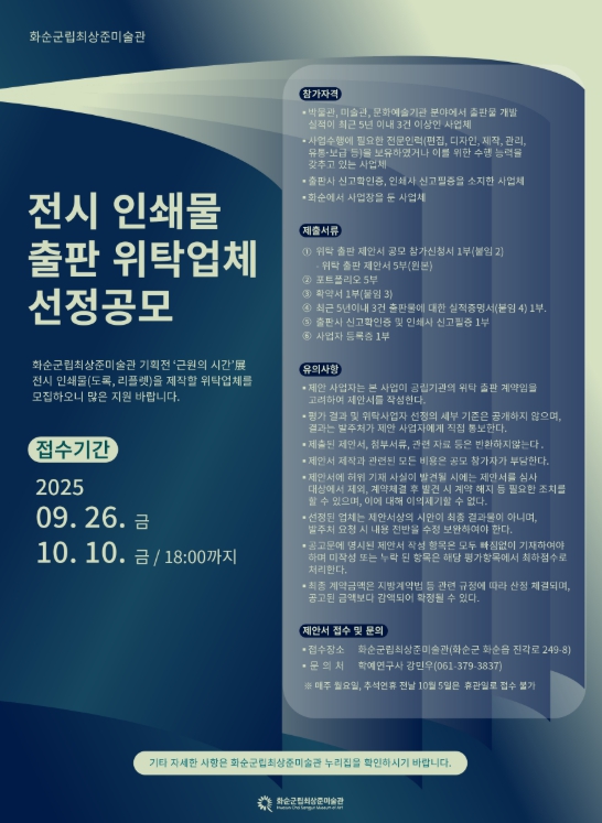 [뉴스앤톡] 화순군은 29일 화순군립최상준미술관 기획전 ‘근원의 시간’ 展의 전시 인쇄물(도록, 리플렛) 제작을 전문적으로 수행할 위탁업체를 공개 모집한다고 밝혔다.