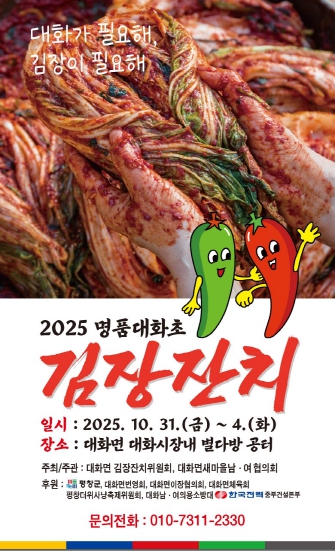 이번 행사를 주관하는 권명식․마영희 명품대화초김장잔치위원회 공동위원장은 “이번 축제를 통해 명품 대화초 고춧가루, 고랭지 절임 배추 등 지역 농산물 품질의 우수성을 널리 알리고, 지역경제 활성화에도 이바지할 수 있길 바란다.”라고 밝혔다.