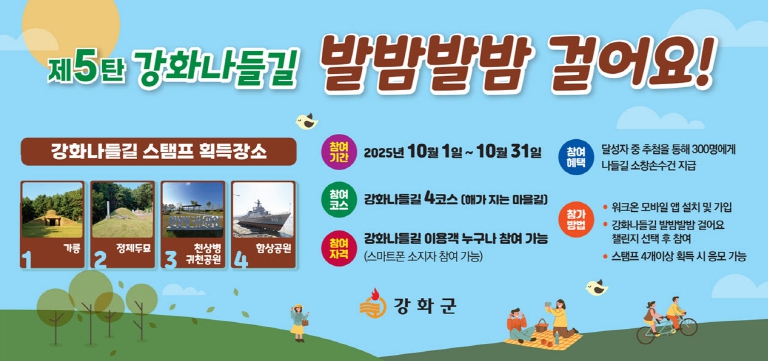 [뉴스앤톡] 강화군은 10월 한 달간 강화나들길 활성화를 위해 ‘제5탄 강화나들길 발밤발밤 걸어요!’ 챌린지를 진행한다고 밝혔다.