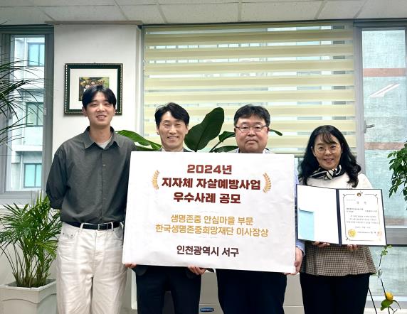 [뉴스앤톡] 인천 서구는 자살예방사업 우수사례 공모 ‘생명존중 안심마을’ 부문에서 한국생명존중희망재단 이사장상을 수상했다고 밝혔다.