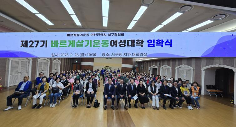 [뉴스앤톡] 바르게살기운동 인천 서구협의회는 9월 27일 서구청 대회의실에서 ‘제27기 바르게살기운동 서구여성대학 입학식’을 개최했다.