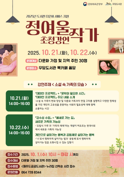 [뉴스앤톡] 제주시 우당도서관은 2025년 도서관 다문화 서비스 지원 사업의 일환으로 ‘정여울 작가 초청 강연’을 오는 10월 21일과 22일 이틀간 북카페 퐁당에서 진행한다.