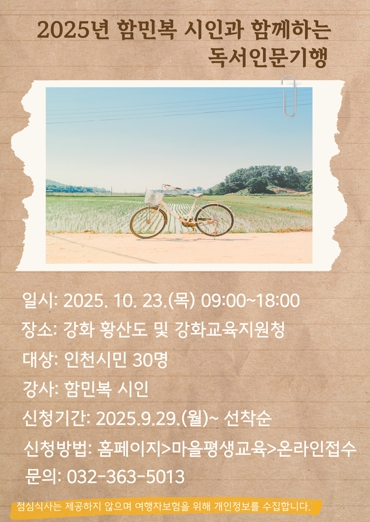 [뉴스앤톡] 인천광역시교육청신트리도서관은 10월 23일 인천시민을 대상으로 ‘함민복 시인과 함께하는 독서인문기행’을 운영한다.