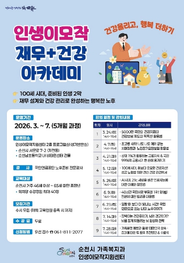 [뉴스앤톡] 순천시는 중·장년층의 삶의 설계와 안정적인 노후 준비를 돕기 위해 ‘재무·건강 아카데미’ 수강생을 3월부터 7월까지 수시 모집한다고 밝혔다.