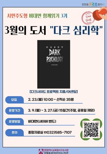 [뉴스앤톡] 인천광역시교육청서구도서관은 2026년 시민주도형 비대면 함께읽기 3기 프로그램 ‘다크심리학 함께 읽기’ 참여자를 모집한다.