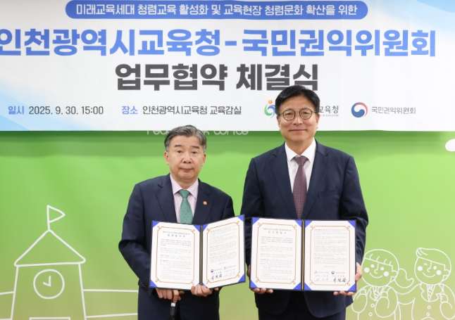 [뉴스앤톡] 인천광역시교육청은 9월 30일 국민권익위원회와 청렴한 미래인재 양성과 교육 현장의 청렴 문화 확산을 위한 업무협약을 체결했다.