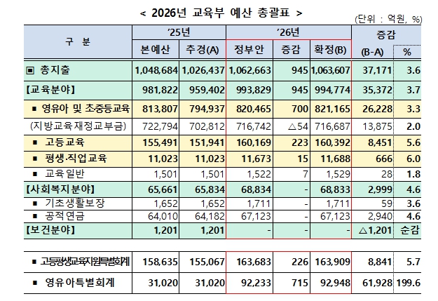 국회 심의 과정에서 2026년도 교육부 예산은 정부안 106조 2,663억 원 대비 945억 원 증액되어 최종 106조 3,607억 원으로 확정됐다. 특히 영유아특별회계를 신설하고, 고등·평생교육지원특별회계의 유효기간을 연장하는 법률 제개정안이 세입예산안 부수 법률안으로 국회 본회의를 통과하여 내년부터 시행될 예정이다.