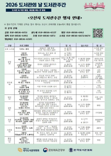 [뉴스앤톡] 오산시는 2026년 도서관의 날(4월 12일)과 도서관주간(4월 12일~4월 18일)을 맞아 시민 누구나 참여할 수 있는 다양한 독서문화 행사를 운영한다고 밝혔다.