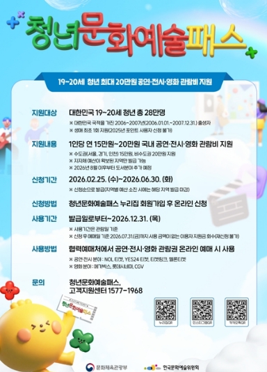 시 관계자는 “청년문화예술패스는 생애 한번 지원되는 사업인 만큼, 영천시 청년들은 빠짐없이 신청해 다양한 문화혜택을 누리길 기대한다”고 말했다.