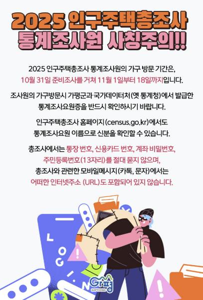 [뉴스앤톡] 가평군은 국가데이터처(옛 통계청)가 주관하는 ‘2025 인구주택총조사’가 진행됨에 따라, 조사원을 사칭한 보이스피싱 및 개인정보 유출 피해에 대한 각별한 주의를 당부했다.