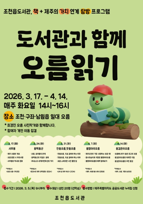 [뉴스앤톡] 제주시 조천읍도서관은 제주의 가치가 담긴 독서문화 탐방 프로그램 ‘도서관과 함께 오름 읽기’를 운영한다.