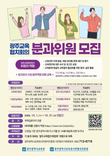 [뉴스앤톡] 광주시교육청시민협치진흥원이 ‘광주교육협치회의 2기 분과위원’을 공개모집한다.