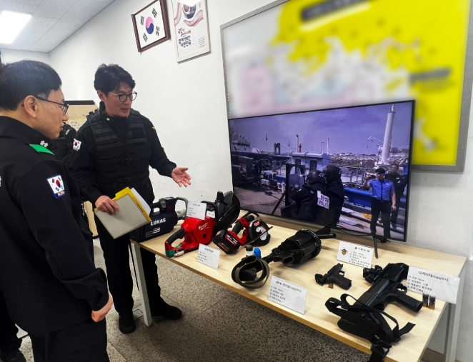 | ▲ 불법 외국어선 대응 장구류를 점검 중인 중부해경청장. |