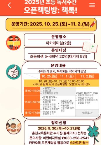 [뉴스앤톡] 춘천교육문화관은 책 읽기 좋은 계절인 가을을 맞아 오는 10월 25일, 10월 28일부터 11월 2일까지 초등학생 5~6학년 학생 20명을 대상으로 초등 독서주간 ‘오픈책팅방 책톡!’을 운영한다.