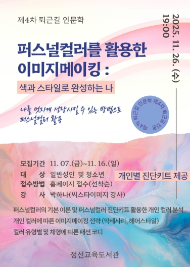 [뉴스앤톡] 정선교육도서관은 11월 26일, 고등학생과 일반 성인을 대상으로 제3차 퇴근길 인문학 “퍼스널컬러를 활용한 이미지메이킹 : 색과 스타일로 완성하는 나” 강연을 운영한다.