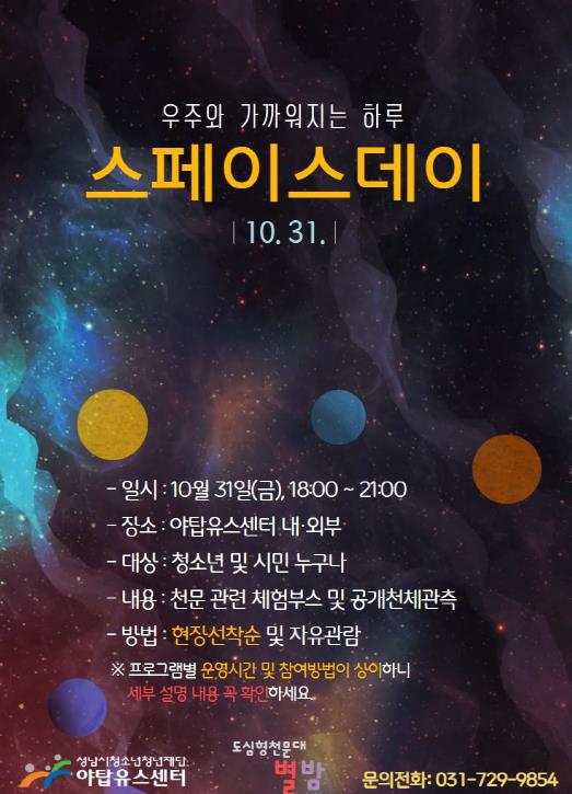 [뉴스앤톡] 성남시청소년청년재단 야탑유스센터는 10월 31일 오후 6시부터 9시까지 청소년과 시민을 대상으로 우주·천문을 주제로 행사 ‘스페이스데이(SPACE DAY)’를 연다고 밝혔다.