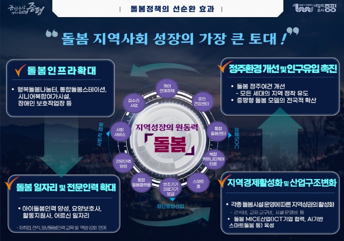 이재영 군수는 “돌봄은 복지를 넘어 일자리와 산업을 창출하고, 지역 경제와 공동체를 성장시키는 힘”이라며 “증평형 돌봄이 대한민국의 새로운 표준이 되도록 모든 역량을 집중하겠다”고 밝혔다.
