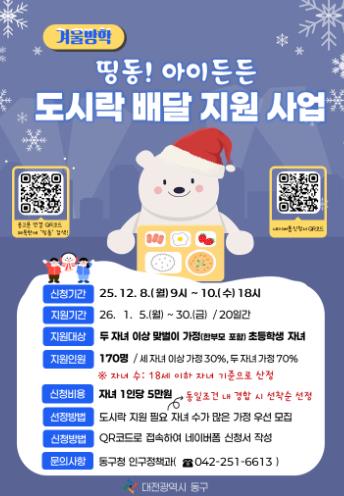 [뉴스앤톡] 대전 동구는 방학기간 동안 맞벌이 가정의 양육 공백을 해소하고 초등학생 자녀의 균형 잡힌 식사를 지원하기 위해 ‘겨울방학 띵동! 아이든든 도시락 배달 지원사업’의 신청자를 모집한다고 24일 밝혔다.