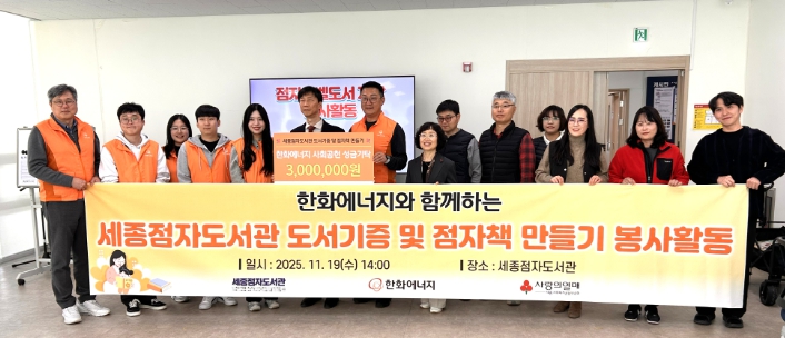 세종점자도서관 이준범 관장은 “점자도서관을 이용하시는 시각장애인들에게 필요한 책들을 한화에너지에서 지원해주시고 봉사활동까지 참여하시며 만들어 주심에 너무 감사드린다”고 소감을 밝혔다.