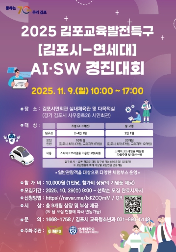 [뉴스앤톡] 김포시가 연세대와 손잡고 전국 규모의 로봇경진대회를 개최한다. 오는 9일 오전 10시부터 오후 5시까지 사우동 김포시민회관 실내체육관에서 개최되는 '2025 김포교육발전특구 [김포시-연세대] AI·SW 경진대회'는 전국 초등학생(4~6학년), 중, 고등학생들을 대상으로 로봇씨름, 자율주행 및 미션수행 등 로봇교구를 활용한 대회다.