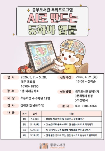 [뉴스앤톡] 김포시 풍무도서관은 가정의 달을 맞아 초등학생 4~6학년을 대상으로 ‘인공지능(AI)으로 만드는 동화와 웹툰’을 오는 5월 7일부터 28일까지 매주 목요일 오후 4시부터 6시까지 총 4회에 걸쳐 운영한다.