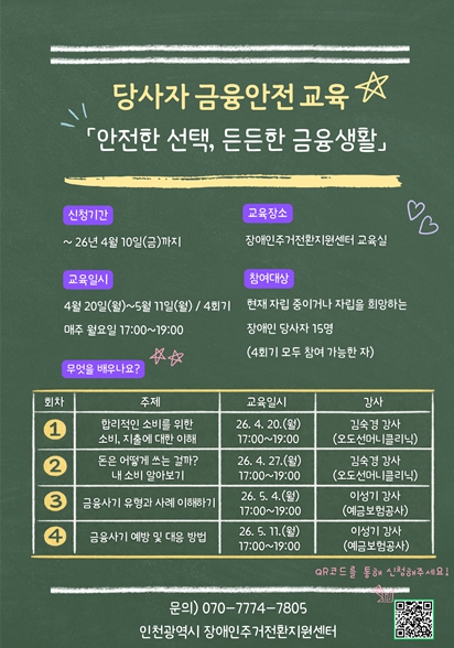 [뉴스앤톡] 인천시사회서비스원 소속 인천시장애인주거전환지원센터는 당사자 금융 안전교육 ‘안전한 선택, 든든한 금융 생활’ 참가자를 모집한다고 6일 밝혔다.