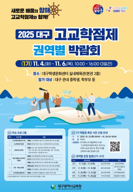 1기 박람회의 특강 신청 기간은 10월 23일 오전 9시부터 10월 29일 오후 6시까지며, 대구시교육청 통합예약시스템 누리집 또는 ‘대구에듀나비-통합예약시스템’에서 ‘고교학점제 박람회 특강’을 검색하여 주제와 일정을 선택하면 된다.