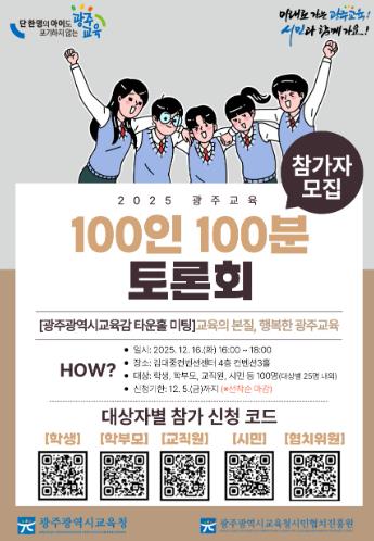 [뉴스앤톡] 광주시교육청시민협치진흥원은 오는 12월 16일 김대중컨벤션센터 4층 컨벤션홀에서 ‘2025 광주교육 100인 100분 토론회’를 개최한다.