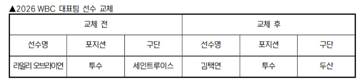 [뉴스앤톡] KBO 전력강화위원회는 부상으로 인해 WBC 참가가 어려워진 세인트루이스 라일리 오브라이언을 대체할 선수로 두산 김택연을 확정하고 WBC 조직위에 선수 교체 승인을 요청했다.