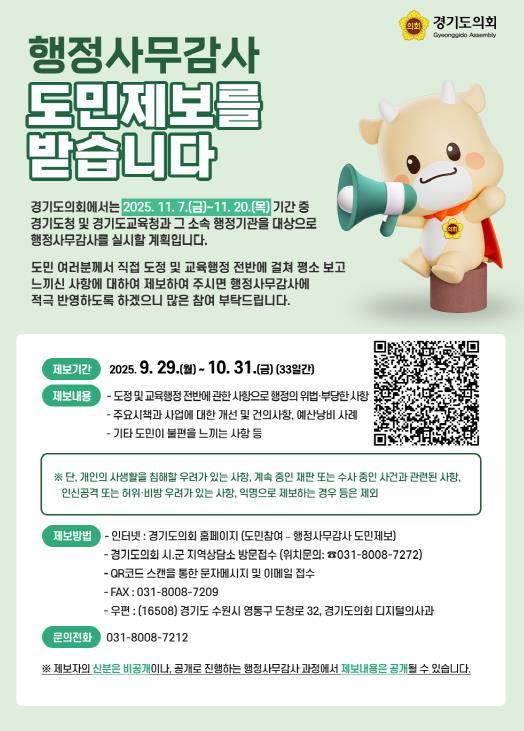 경기도의회는 도민 참여형 감사를 실현하기 위해 도민제보 제도를 운영하고 있으며, 접수된 제보는 상임위원회별 감사자료로 활용될 예정이다.
